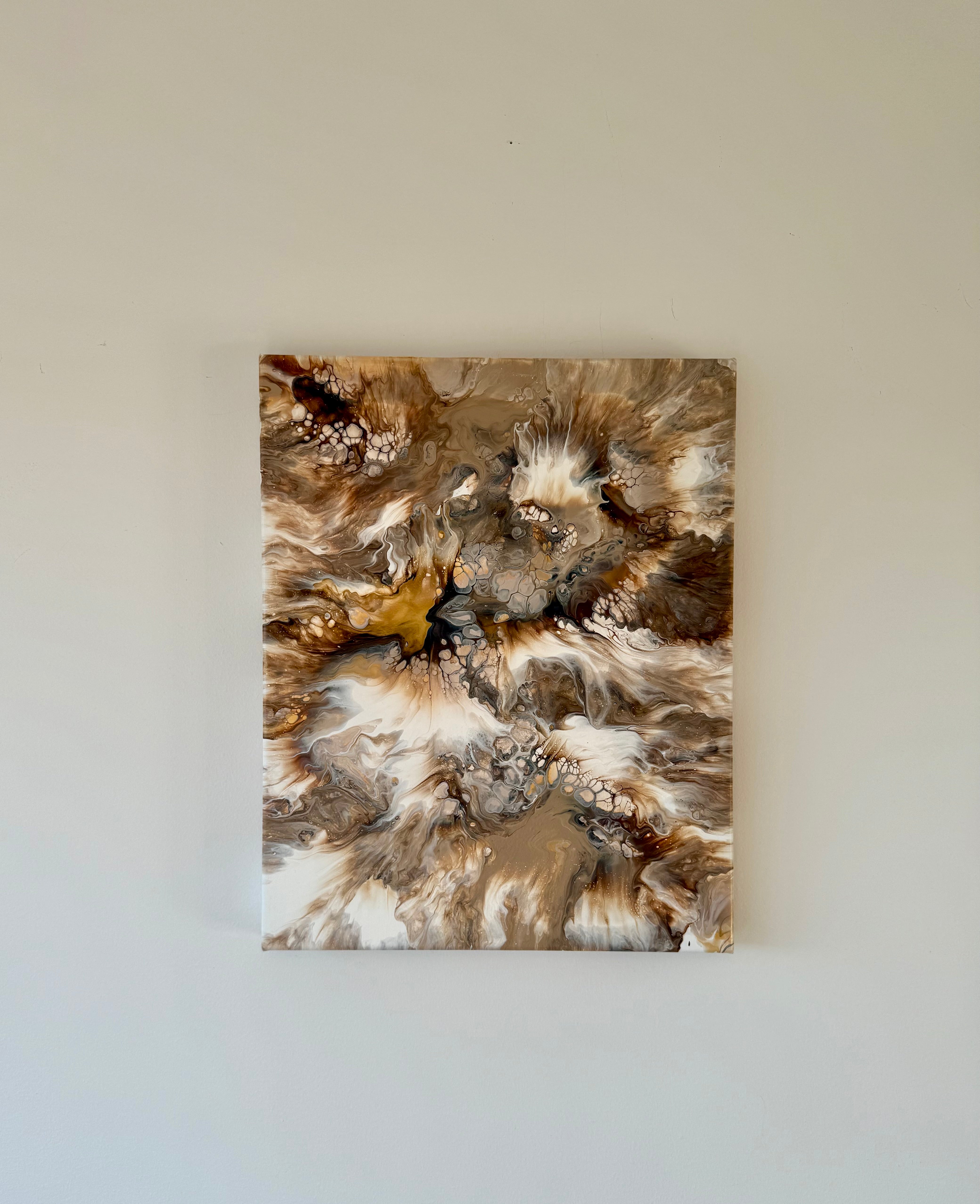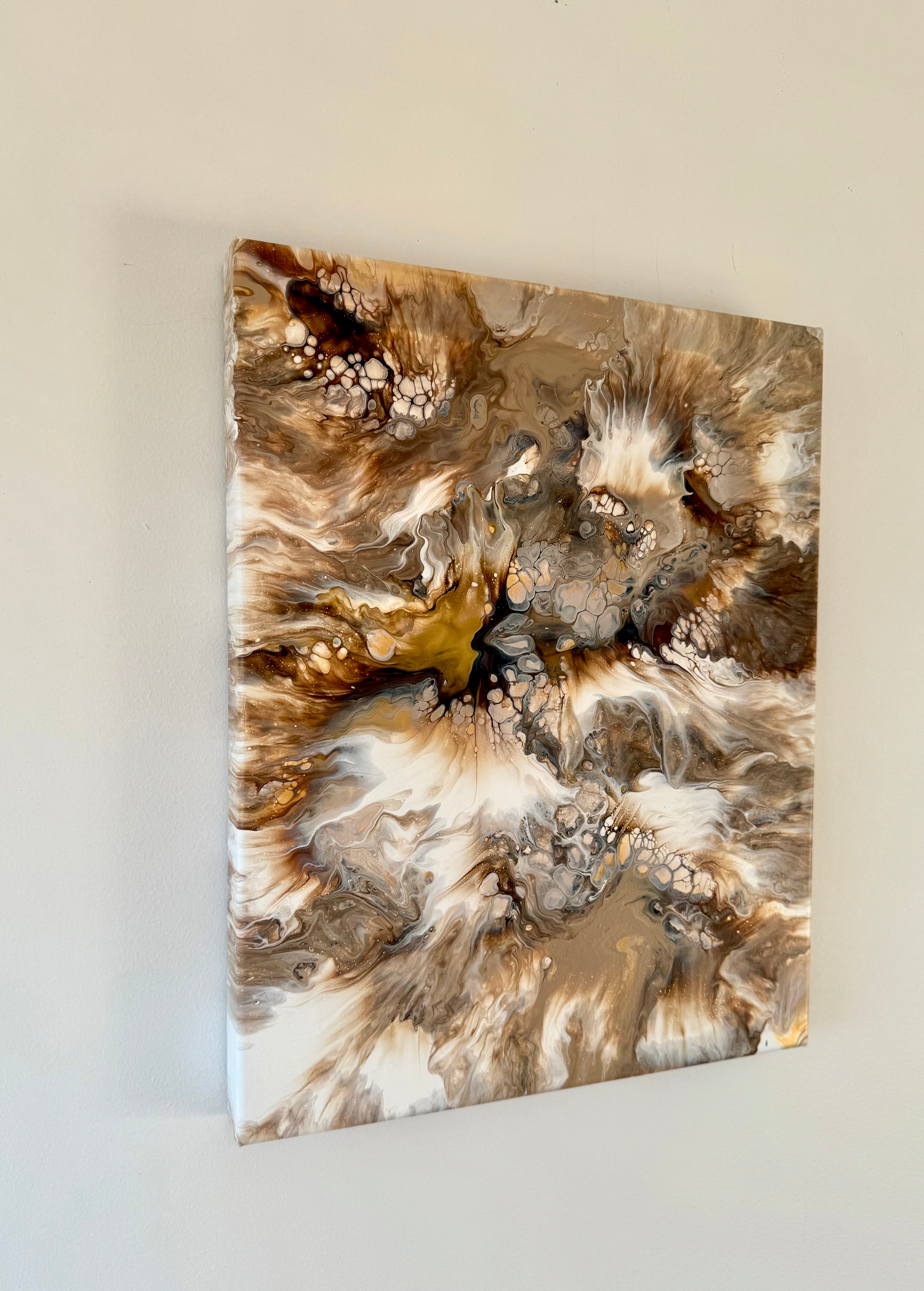 Et abstrakt maleri med tydelig struktur og lag. Duse toner kombinert med varme gullnyanser gir verket dybde, ro og karakter.